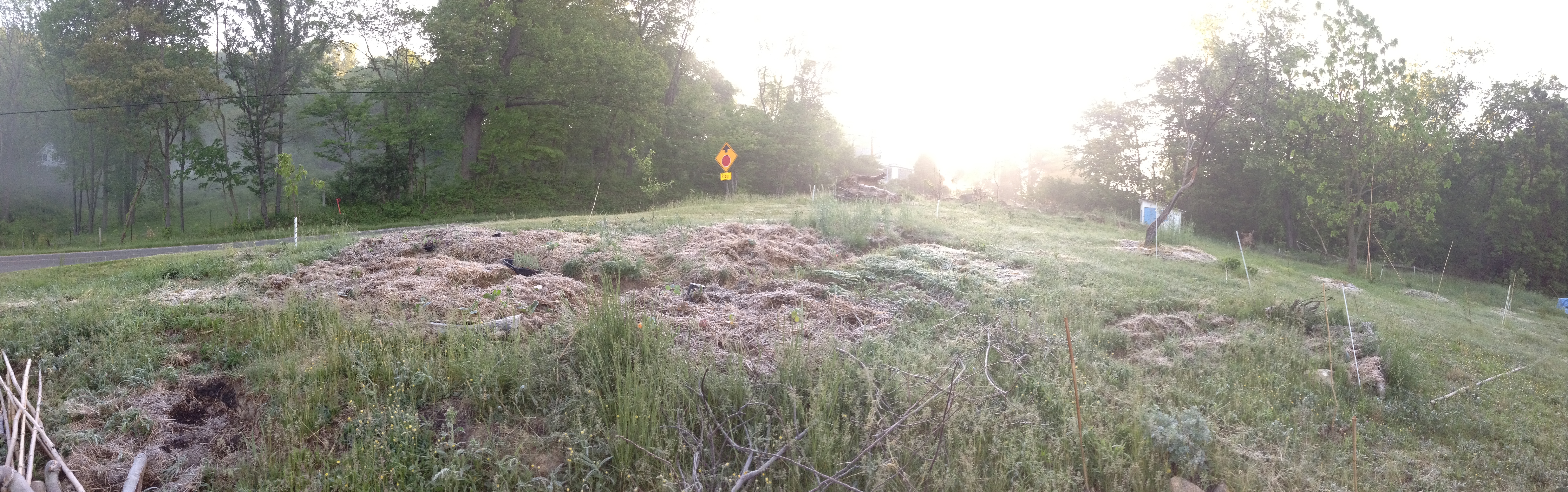 This picture says a lot. It says this food forest is not super secluded, is on a slope, is south-west facing, that it is a young food forest which is just getting started. If you read into the picture further you might guess that the white sticks are marking plants I have in the ground, and that the straw covered spot is a vegetable area. Some things this picture doesn’t say are what flora and fauna of the plants are planted there, and what plants are going to be planted there. It also doesn’t show a fraction of the design that is already figured and ready to come into play, or what reasons are behind those designs.