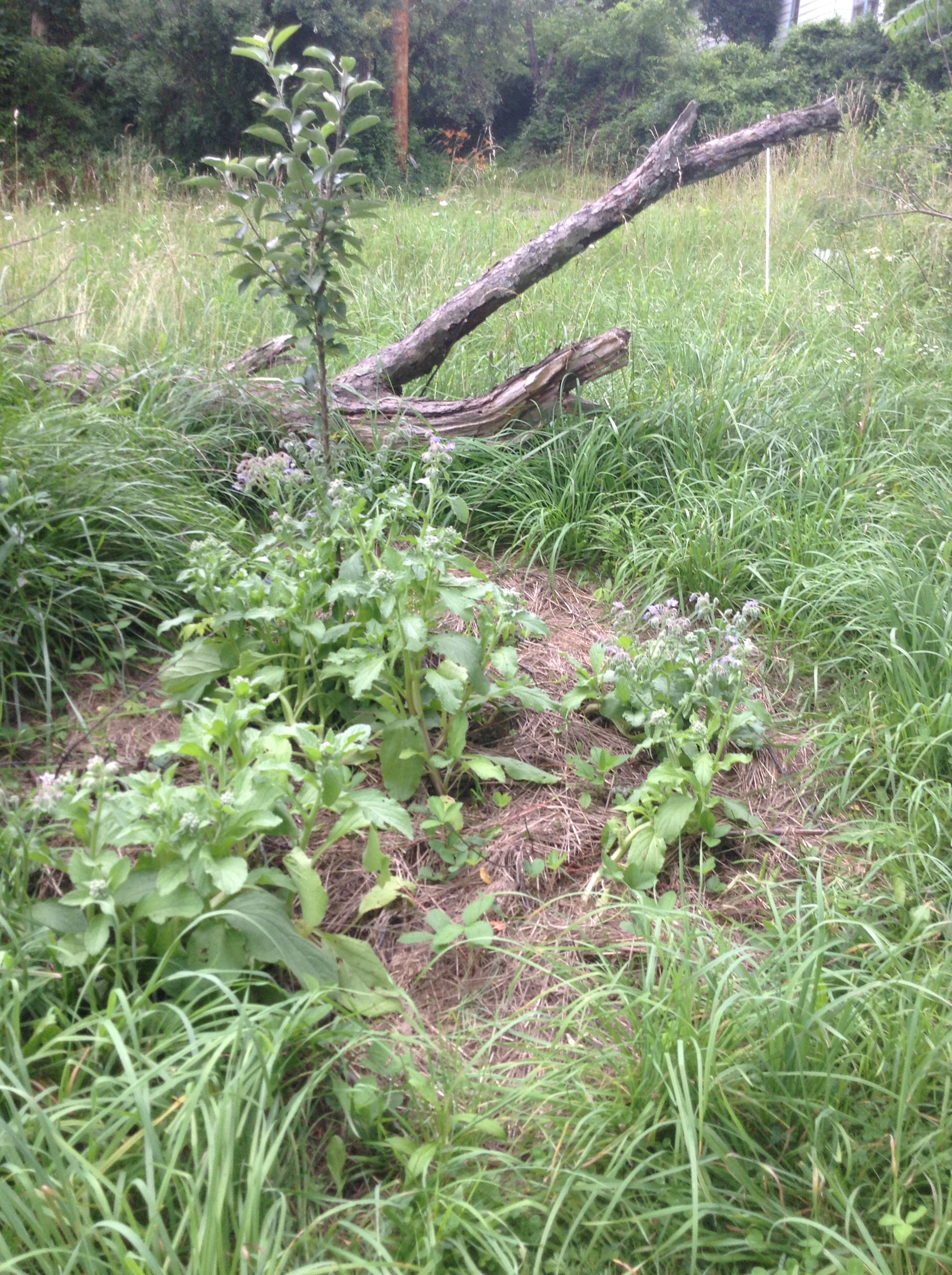 About a month ago I posted about the technique I was using in my food forest to get rid of the grass and make planting beds for more desirable plants. Here is the patch I had planted with strawberries and borage as shown in the Group and Conquer! post.