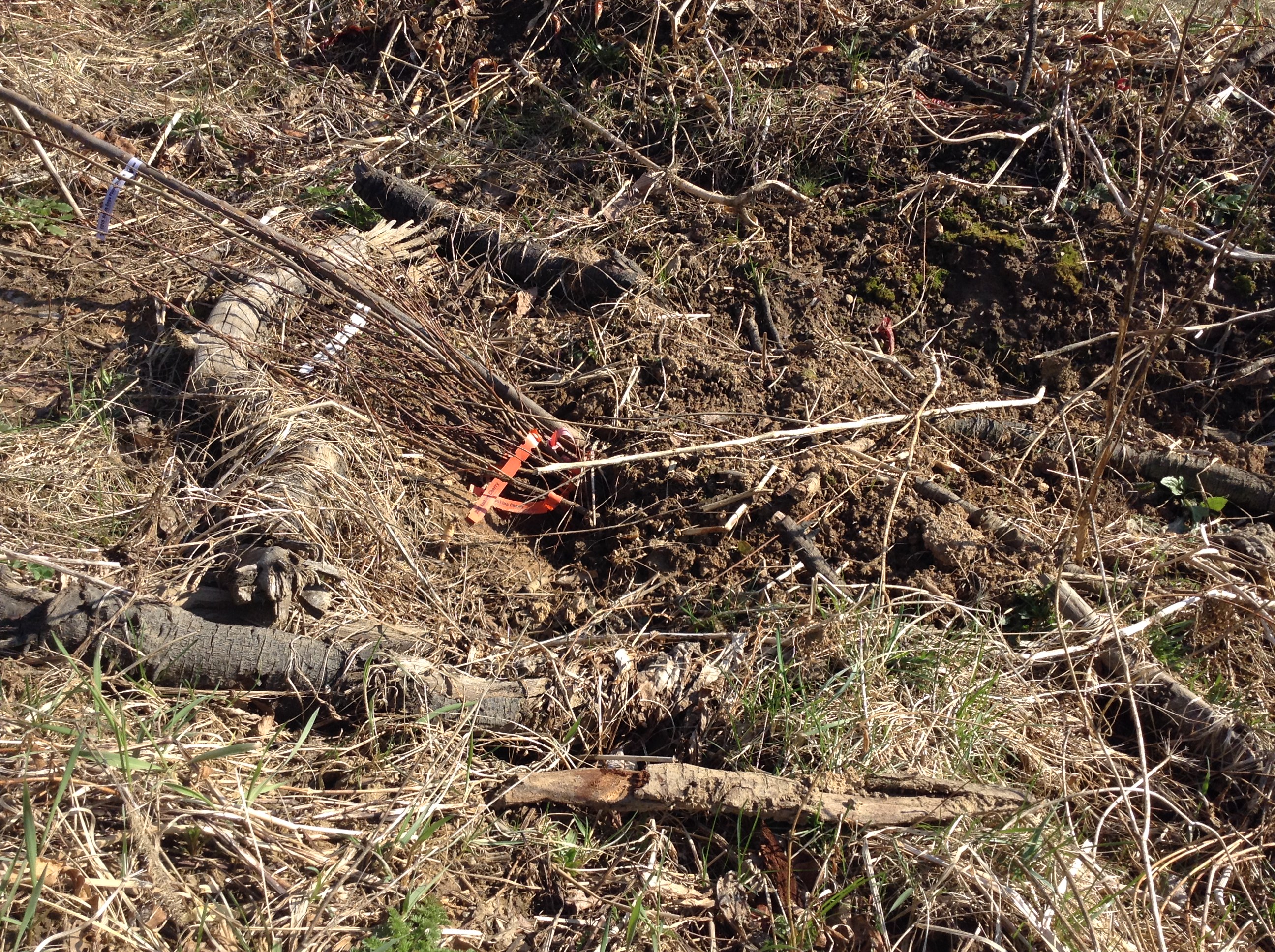 I’ve found that my water catchment ditch is the ideal place for heeling in plants. The walls give some protection from wind, and make a warm little microclimate by raying back heat from the day. Water that collects there seldom stays a puddle, but rather keeps the ground evenly moist between rains. It’s ideal.
