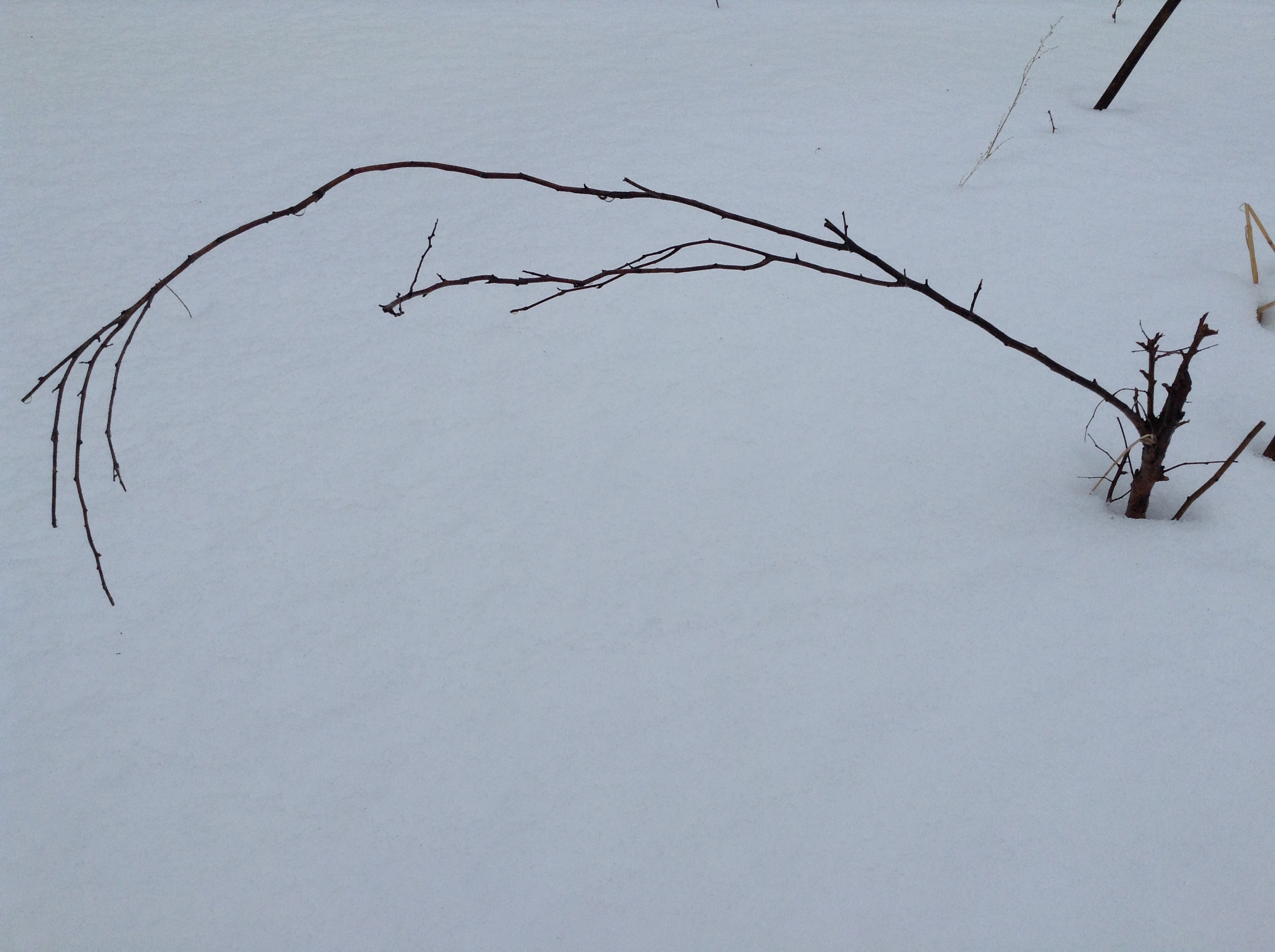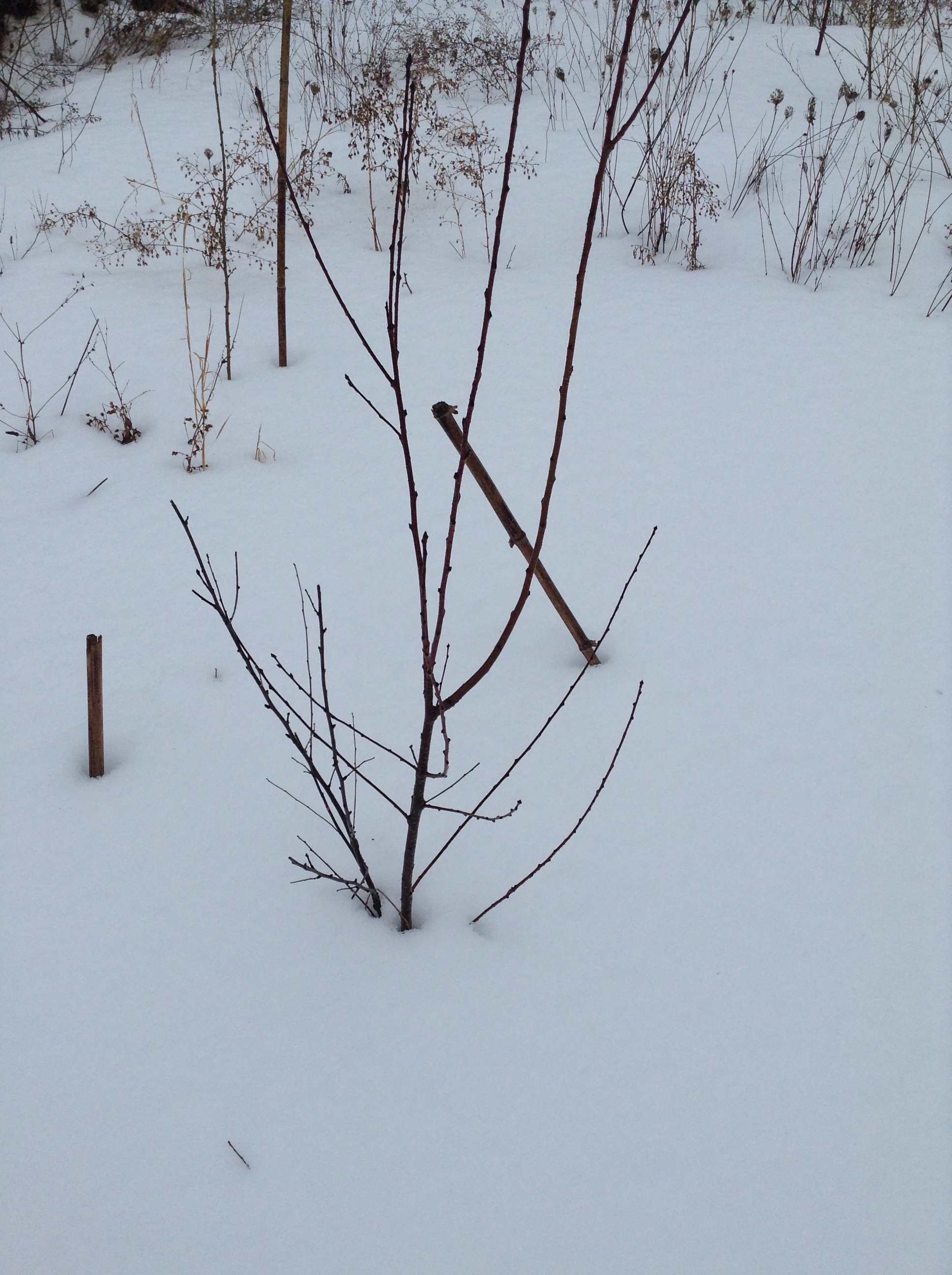 The first was one of my two snow peach trees that were weeds out of a friend’s flowerbeds. Winter before last it was nipped on the top branches during the era of goats and so decided to stop growing, sending up a new shoot from the roots. These two shoots side by side worried me, because I knew if the tree was allowed to grow this way the two sides would crack apart, or rub on each other, and cause a whole host of problems for the tree.