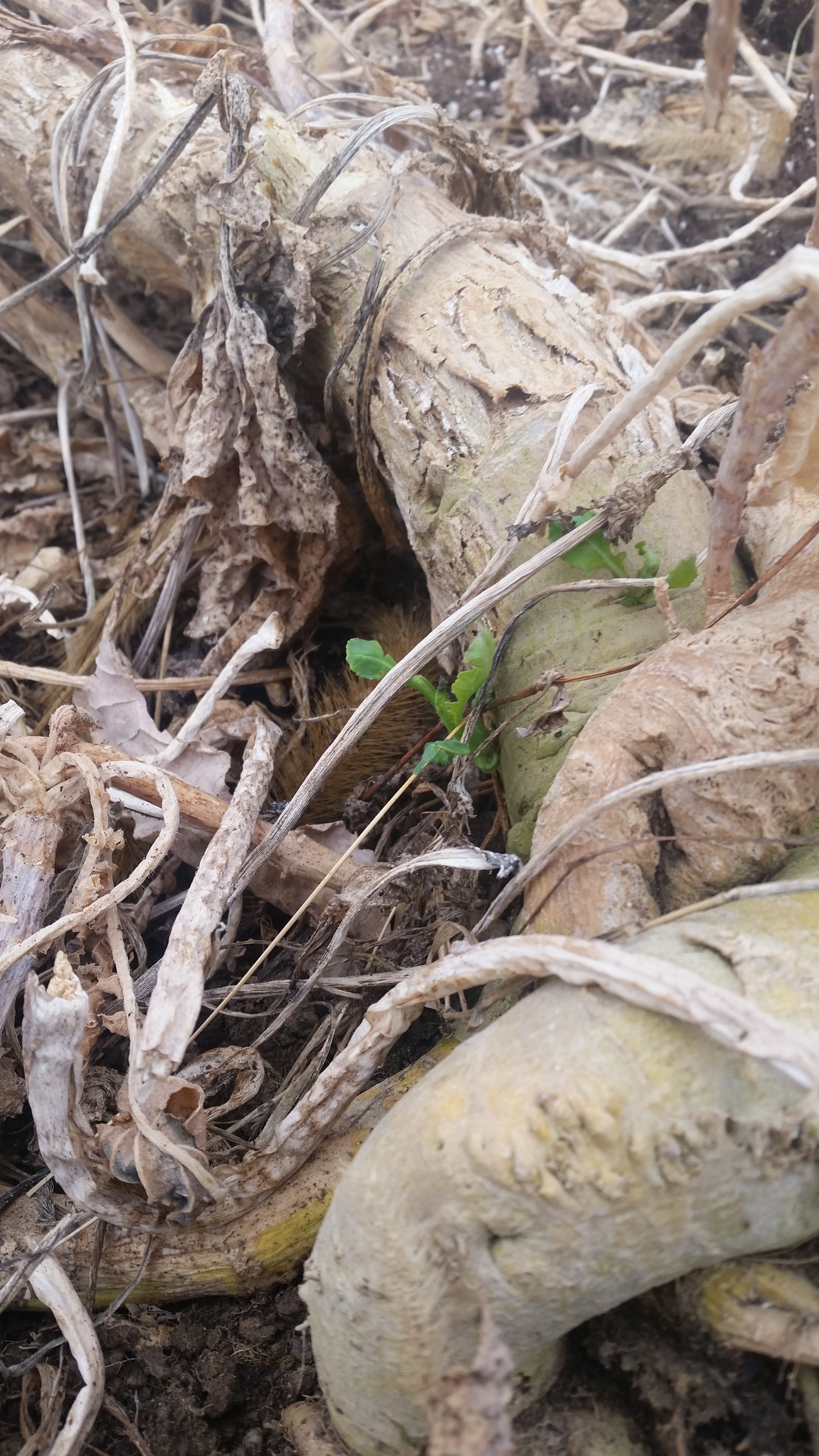 Winter was not kind to the Sutherland kale, or any kale I had in my greenhouse. It has died back to about four inches above the roots where it’s pushing out two weakly sprouts.