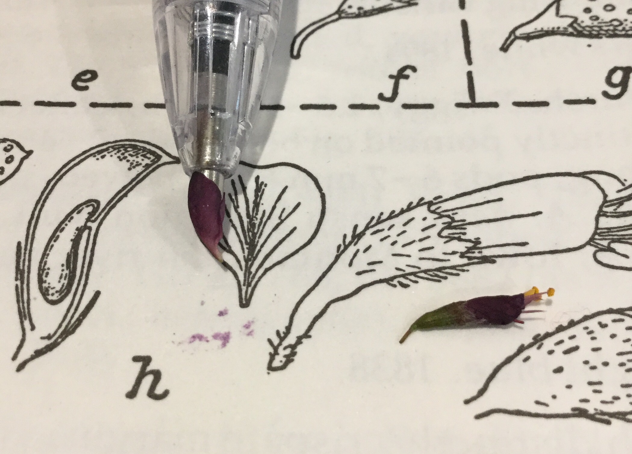 Petal next to fruticosa illustrationThe flowers from my plants grown from the companies seed have especially wide petals I could not even make lay flat without ripping. So I spread it as best I could on a pen tip to show the plush width and lack of spots. I’ll let you derive the ID. It seems quite evident to me.