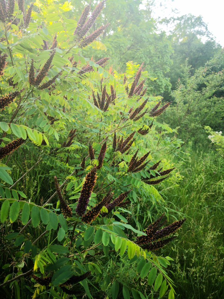 Amorpha fruticosa flowering on lush branches perfect for mulch in the food forest.