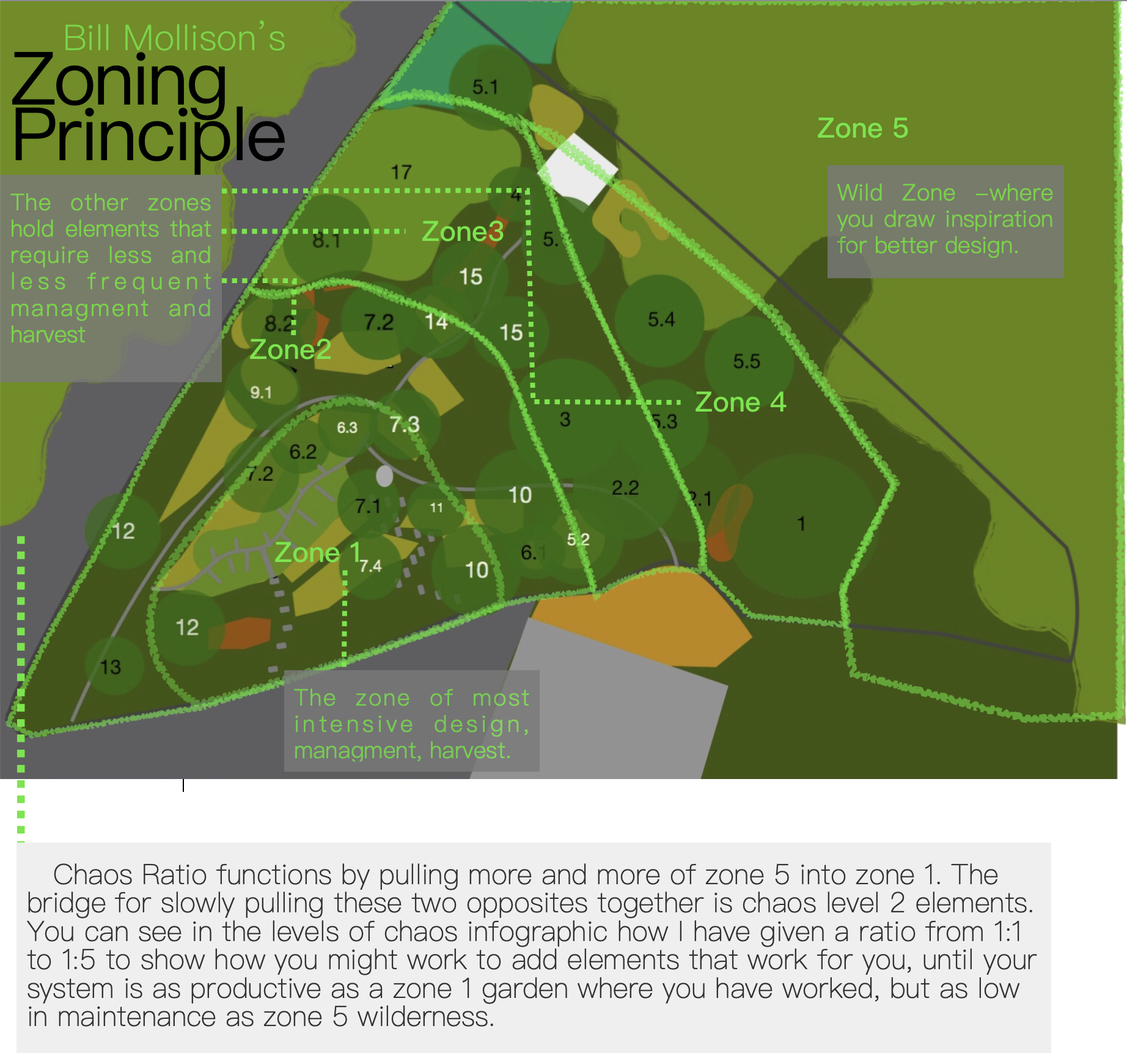 The concept for Chaos Ratio has its roots in Mollison’s Zoning Principle. Mollison’s Zoning Principle states that parts of a system that require work should be close to where you live. Parts of a system that need more work are closer, and parts that need less work are further.